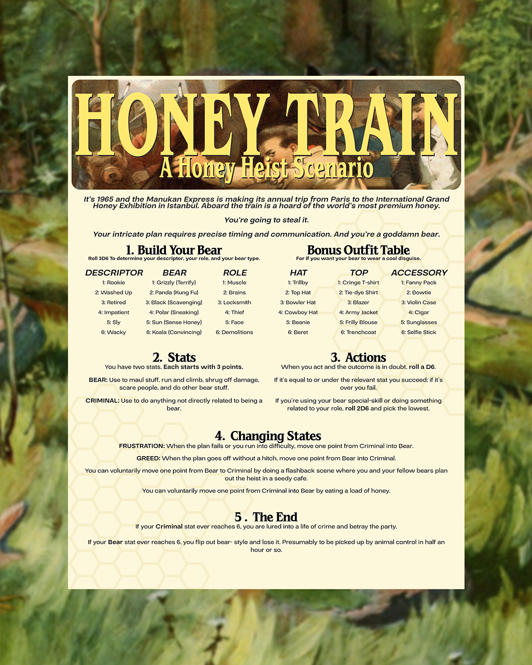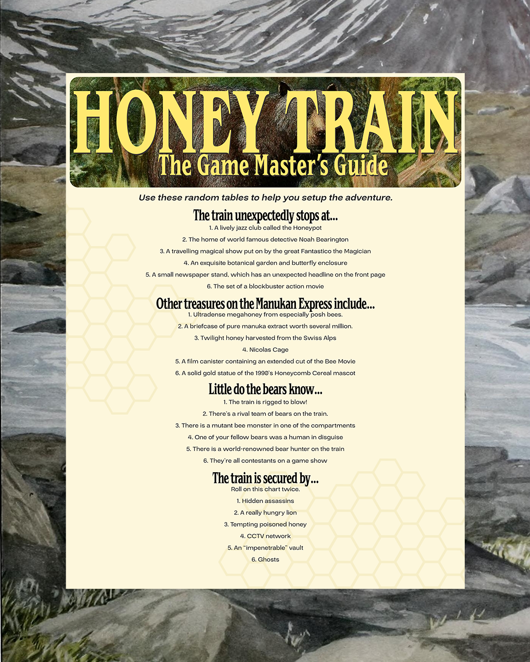 Honey Train is a scenario for Grant Howitt’s Honey Heist, and is inspired by 2022’s Bullet Train and 1974’s Murder on the Orient Express.